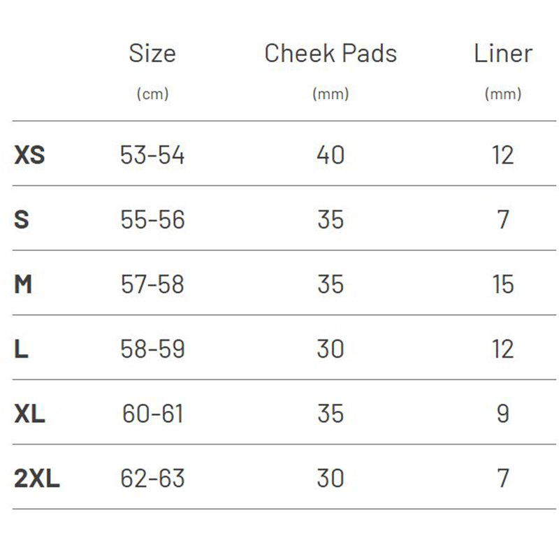 | Size | Size (cm) | Cheek Pads (mm) | Liner (mm) |