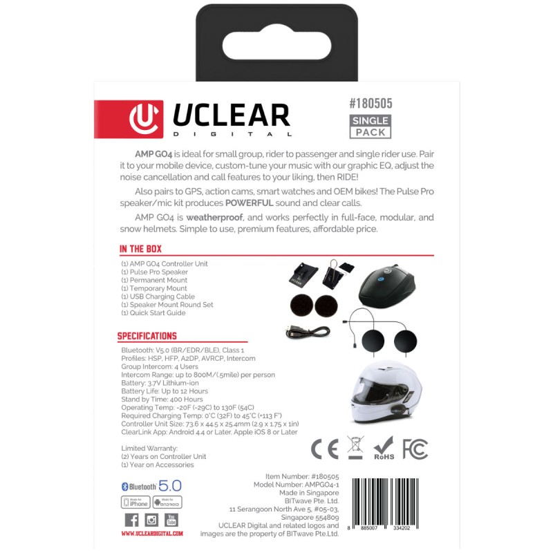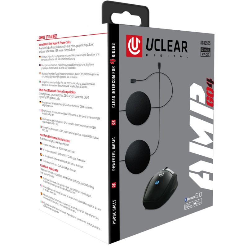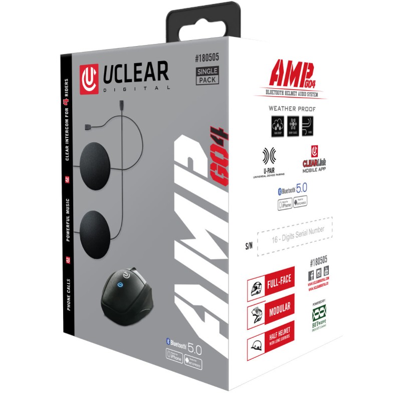 The UCLEAR AMP GO4 full-duplex Bluetooth® helmet audio system is ideal for single rider and small group communications. Using the included Pulse Pro speaker system, you can enjoy exceptional audio quality as you head down the highway. Our exclusive noise-cancelling ABF technology eliminates virtually all background noise, while our patented DSP algorithms triangulate your voice’s “sweet spot” to produce clear voice for phone calls and intercom conversations. The UCLEAR Digital AMP GO4 is built on the foundation of the popular Bluetooth® AMP Series. The AMP GO4 has Bluetooth® 5.0 connectivity, ClearLink and enhanced audio. The AMP GO4 is simply the most feature rich entry level product available!